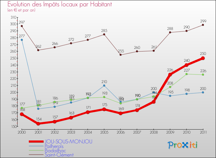 Pendant la même période, les communes françaises similaires à Jou-sous-Monjou, ont vu leurs impôts locaux par habitant augmenter de 17.07 % en moyenne entre 2000 et 2011.