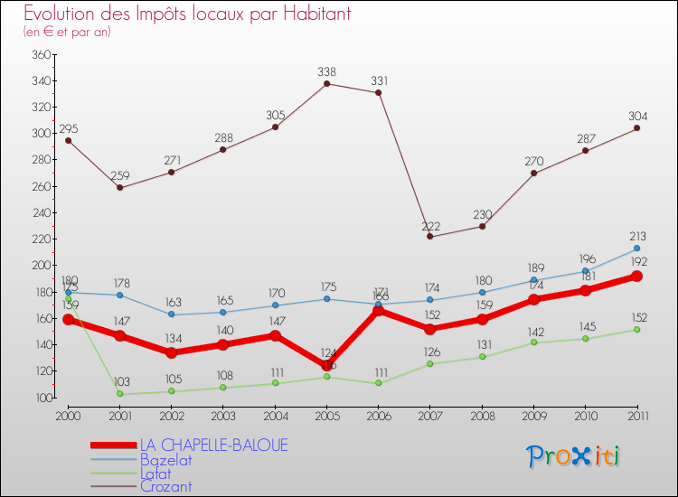 A La Chapelle-Baloue, les impôts locaux par habitant ont donc augmentés de 20.75 % entre 2000 et 2011.