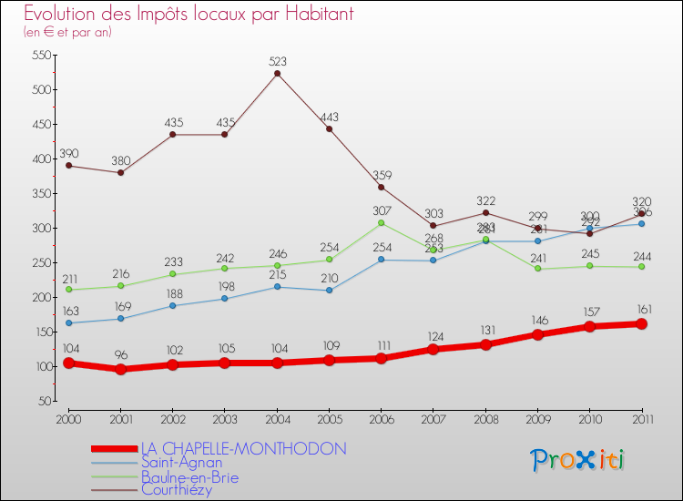 A La Chapelle-Monthodon, les impôts locaux par habitant ont donc augmentés de 54.81 % entre 2000 et 2011.