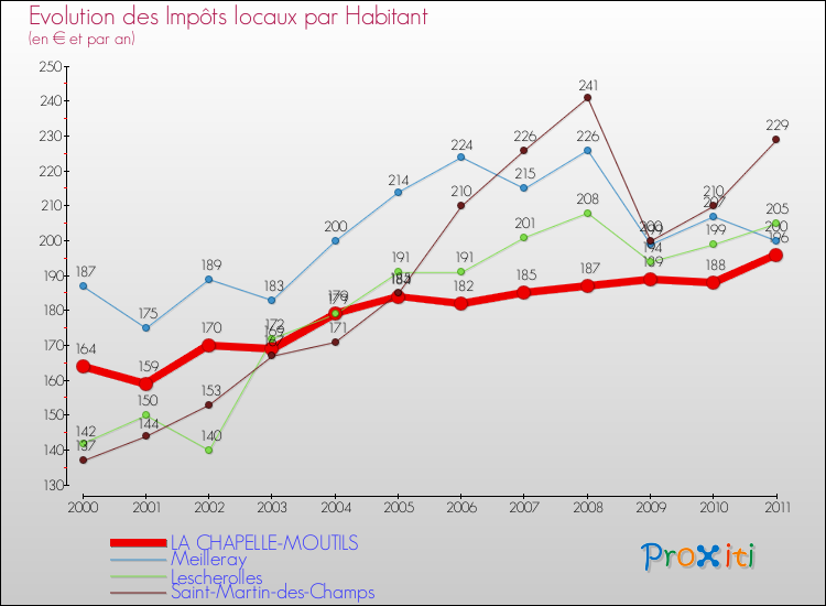 A La Chapelle-Moutils, les impôts locaux par habitant ont donc augmentés de 19.51 % entre 2000 et 2011.