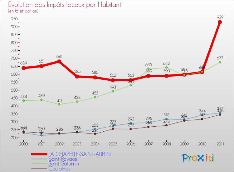 A La Chapelle-Saint-Aubin, les impôts locaux par habitant ont donc augmentés de 45.38 % entre 2000 et 2011.