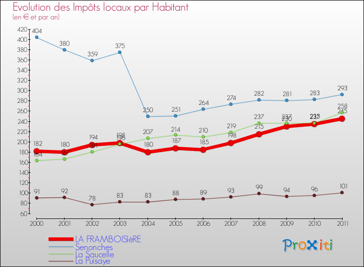 A La Framboisière, les impôts locaux par habitant ont donc augmentés de 34.62 % entre 2000 et 2011.