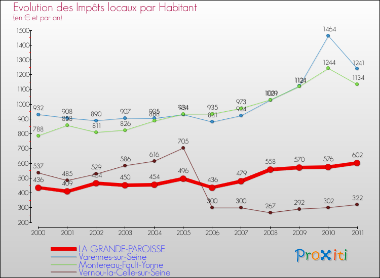 A La Grande-Paroisse, les impôts locaux par habitant ont donc augmentés de 38.07 % entre 2000 et 2011.