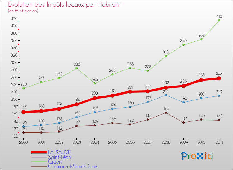 A La Sauve, les impôts locaux par habitant ont donc augmentés de 55.76 % entre 2000 et 2011.