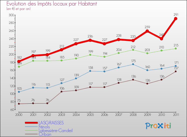 A Lasgraisses, les impôts locaux par habitant ont donc augmentés de 59.89 % entre 2000 et 2011.