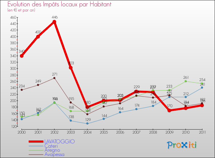 A Lavatoggio, les impôts locaux par habitant ont donc baissés de 45.29 % entre 2000 et 2011.