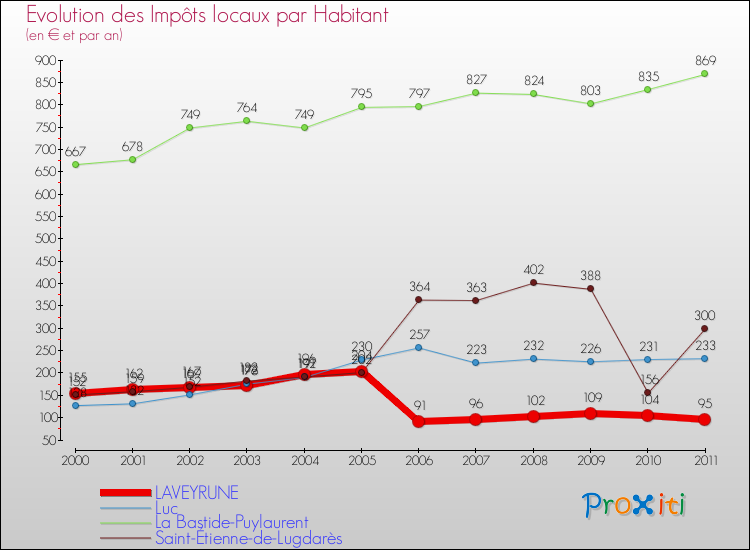 A Laveyrune, les impôts locaux par habitant ont donc baissés de 38.71 % entre 2000 et 2011.