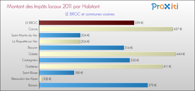 A noter : la valeur moyenne des impôts locaux dans les communes françaises similaires à Le Broc était de 269 € par habitant, en 2011.