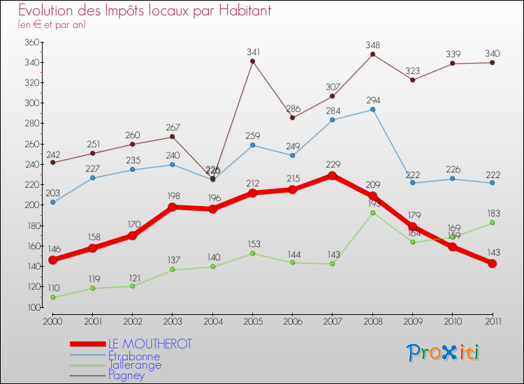 A Le Moutherot, les impôts locaux par habitant ont donc baissés de 2.05 % entre 2000 et 2011.