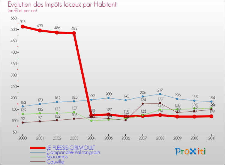 A Le Plessis-Grimoult, les impôts locaux par habitant ont donc baissés de 76.8 % entre 2000 et 2011.