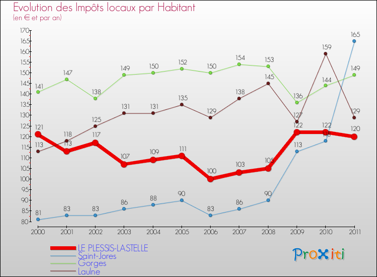 A Le Plessis-Lastelle, les impôts locaux par habitant ont donc baissés de 0.83 % entre 2000 et 2011.