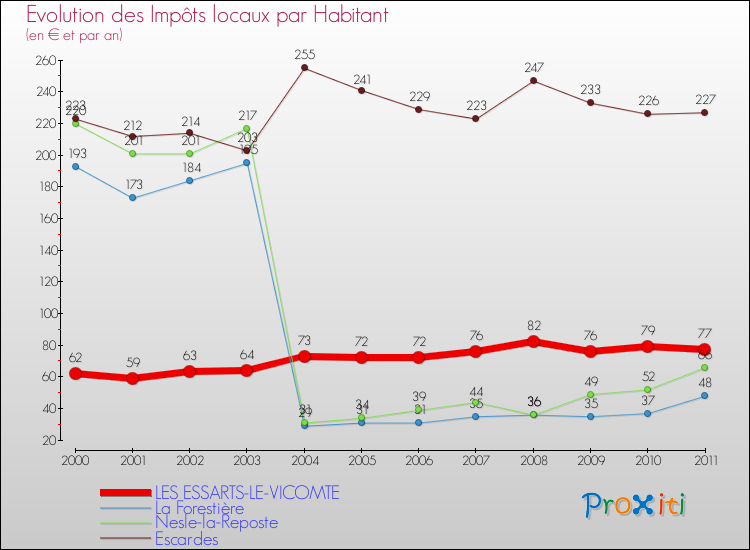 A Les Essarts-le-Vicomte, les impôts locaux par habitant ont donc augmentés de 24.19 % entre 2000 et 2011.