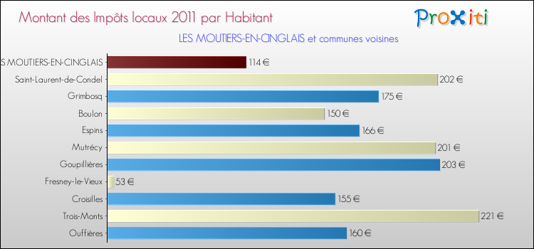 A noter : la valeur moyenne des impôts locaux dans les communes françaises similaires à Les Moutiers-en-Cinglais était de 234 € par habitant, en 2011.