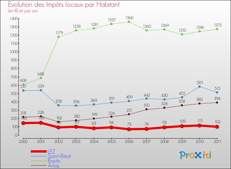 A Lez, les impôts locaux par habitant ont donc baissés de 29.66 % entre 2000 et 2011.