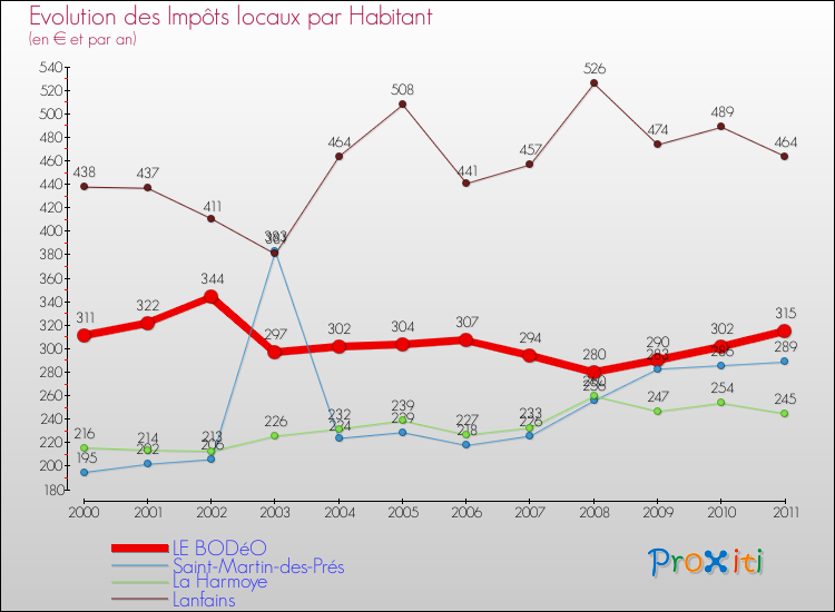 A Le Bodéo, les impôts locaux par habitant ont donc augmentés de 1.29 % entre 2000 et 2011.