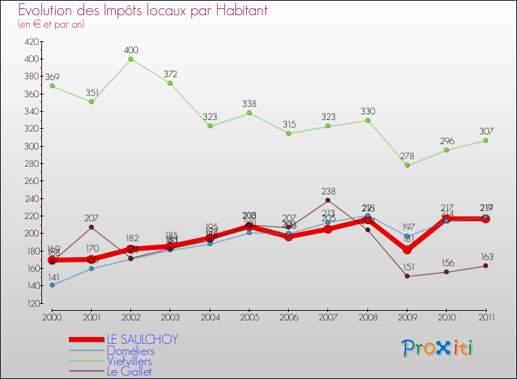 A Le Saulchoy, les impôts locaux par habitant ont donc augmentés de 28.4 % entre 2000 et 2011.