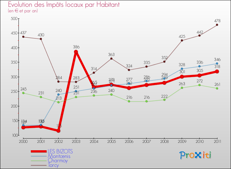 A Les Bizots, les impôts locaux par habitant ont donc augmentés de 150.39 % entre 2000 et 2011.