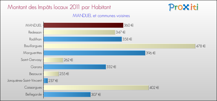 A noter : la valeur moyenne des impôts locaux dans les communes françaises similaires à Manduel était de 424 € par habitant, en 2011.