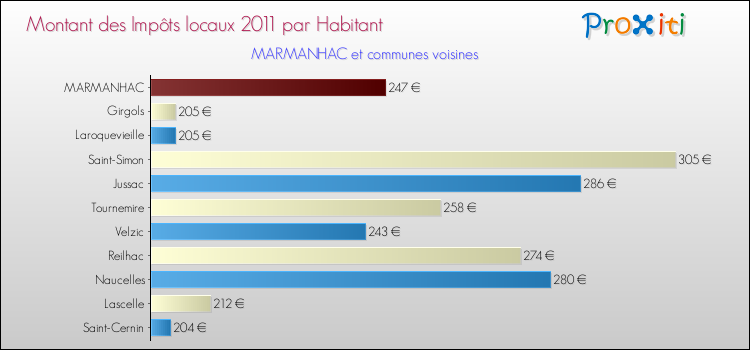 A noter : la valeur moyenne des impôts locaux dans les communes françaises similaires à Marmanhac était de 269 € par habitant, en 2011.