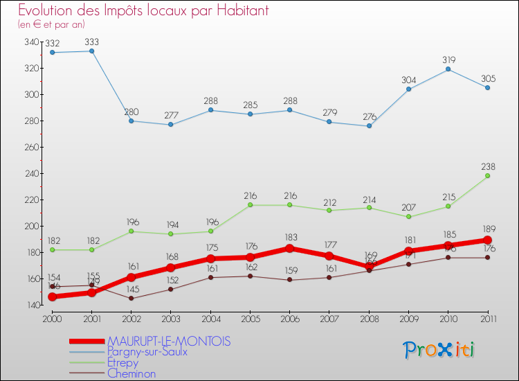 Pendant la même période, les communes françaises similaires à Maurupt-le-Montois, ont vu leurs impôts locaux par habitant augmenter de 37.6 % en moyenne entre 2000 et 2011.