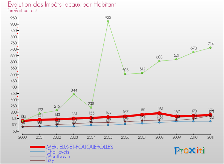 A Merlieux-et-Fouquerolles, les impôts locaux par habitant ont donc augmentés de 35.61 % entre 2000 et 2011.