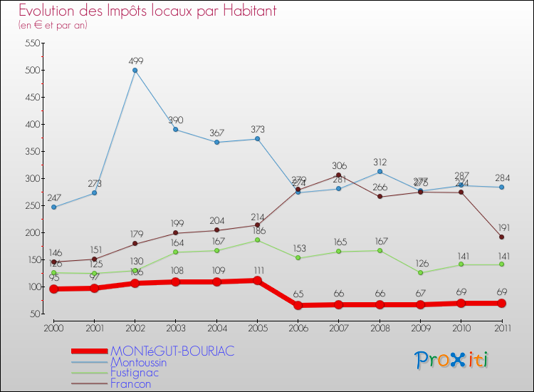 A Montégut-Bourjac, les impôts locaux par habitant ont donc baissés de 27.37 % entre 2000 et 2011.
