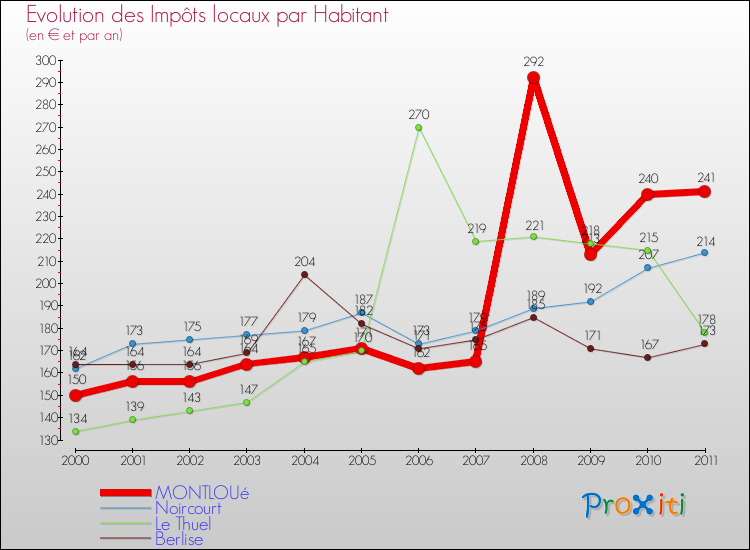 A Montloué, les impôts locaux par habitant ont donc augmentés de 60.67 % entre 2000 et 2011.
