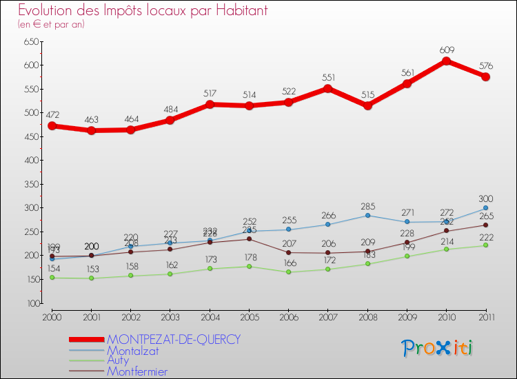 A Montpezat-de-Quercy, les impôts locaux par habitant ont donc augmentés de 22.03 % entre 2000 et 2011.