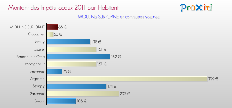 A noter : la valeur moyenne des impôts locaux dans les communes françaises similaires à Moulins-sur-Orne était de 264 € par habitant, en 2011.