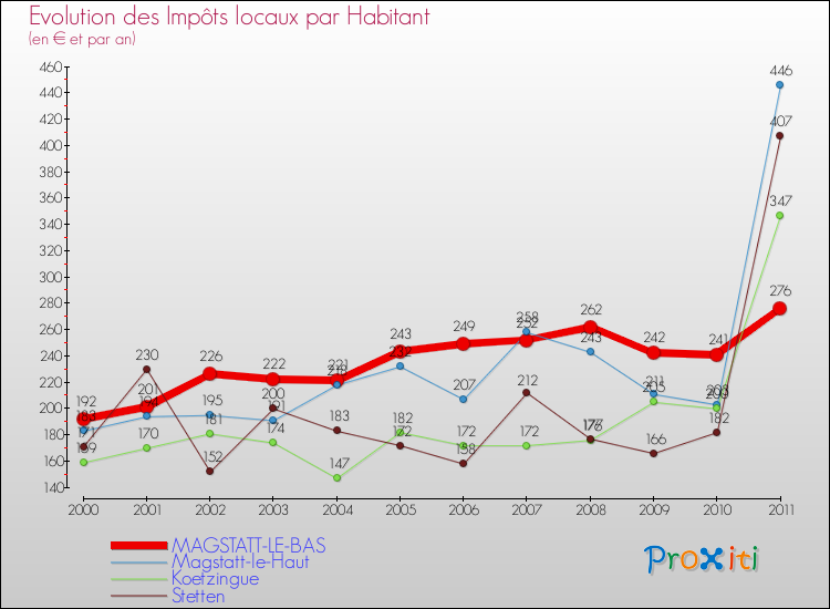 A Magstatt-le-Bas, les impôts locaux par habitant ont donc augmentés de 43.75 % entre 2000 et 2011.