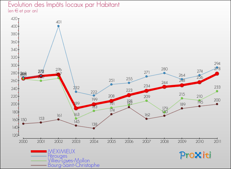 A Meximieux, les impôts locaux par habitant ont donc augmentés de 4.51 % entre 2000 et 2011.