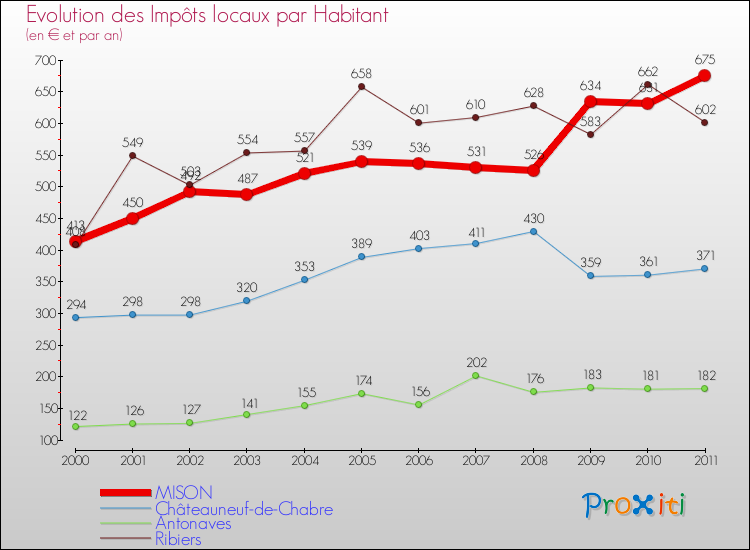 A Mison, les impôts locaux par habitant ont donc augmentés de 63.44 % entre 2000 et 2011.