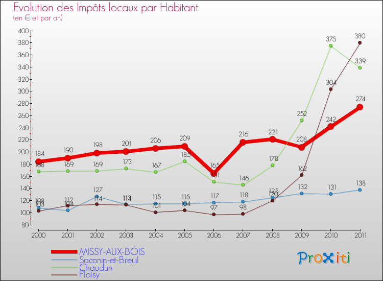 A Missy-aux-Bois, les impôts locaux par habitant ont donc augmentés de 48.91 % entre 2000 et 2011.