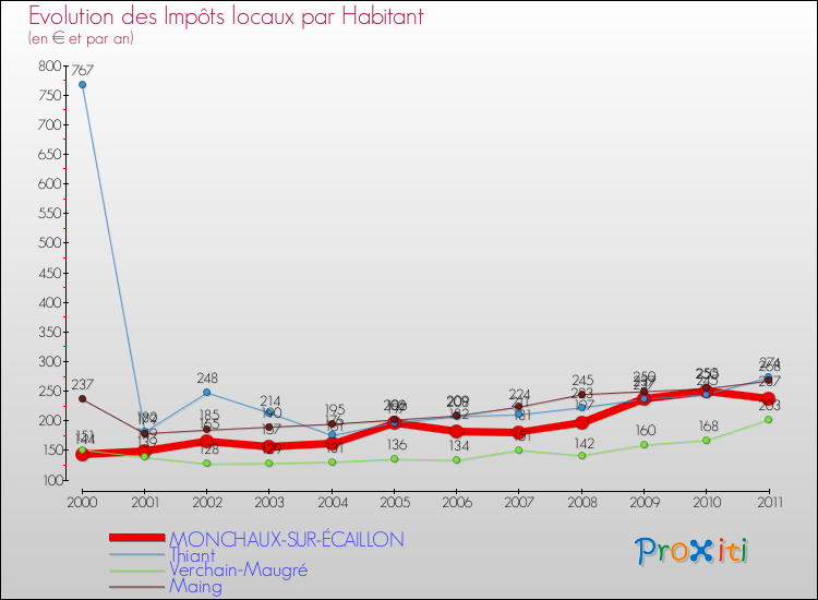 A Monchaux-sur-Écaillon, les impôts locaux par habitant ont donc augmentés de 64.58 % entre 2000 et 2011.