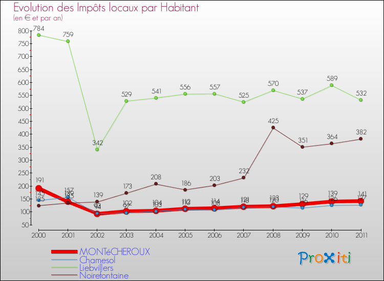 Le graphique ci dessous représente l'évolution des impôts locaux par habitant à Montécheroux depuis 2000.