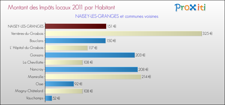 A noter : la valeur moyenne des impôts locaux dans les communes françaises similaires à Naisey-les-Granges était de 333 € par habitant, en 2011.