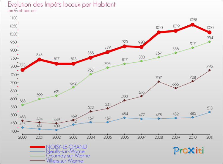 A Noisy-le-Grand, les impôts locaux par habitant ont donc augmentés de 29.82 % entre 2000 et 2011.