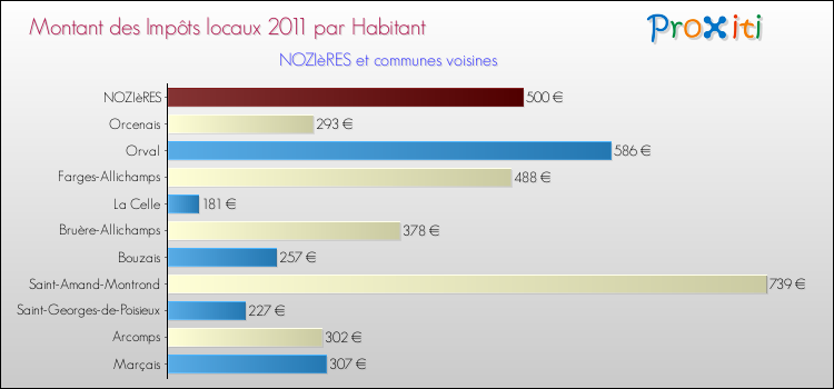 A noter : la valeur moyenne des impôts locaux dans les communes françaises similaires à Nozières était de 238 € par habitant, en 2011.