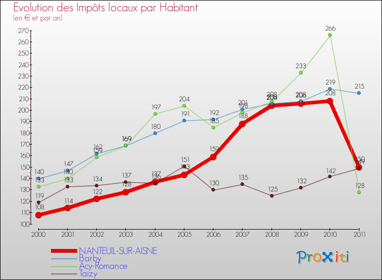 A Nanteuil-sur-Aisne, les impôts locaux par habitant ont donc augmentés de 38.89 % entre 2000 et 2011.