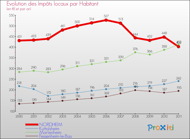 A Nordheim, les impôts locaux par habitant ont donc baissés de 6.73 % entre 2000 et 2011.
