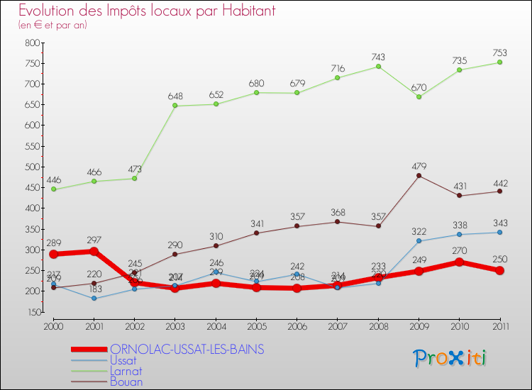 A Ornolac-Ussat-les-Bains, les impôts locaux par habitant ont donc baissés de 13.49 % entre 2000 et 2011.