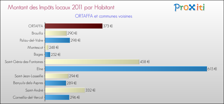 A noter : la valeur moyenne des impôts locaux dans les communes françaises similaires à Ortaffa était de 269 € par habitant, en 2011.