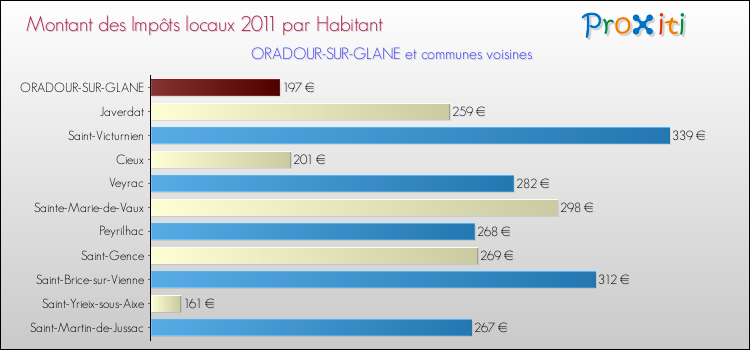 A noter : la valeur moyenne des impôts locaux dans les communes françaises similaires à Oradour-sur-Glane était de 334 € par habitant, en 2011.