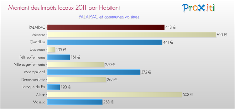 A Palairac, les impôts locaux par habitant sont donc plus élevés de 88.24 % que pour des communes similaires.