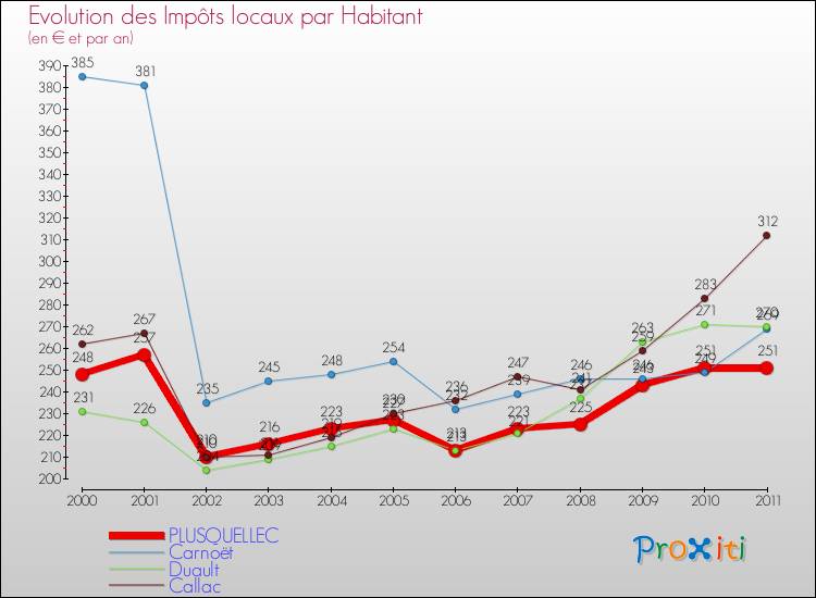 A Plusquellec, les impôts locaux par habitant ont donc augmentés de 1.21 % entre 2000 et 2011.