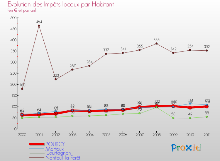 A Pourcy, les impôts locaux par habitant ont donc augmentés de 60.32 % entre 2000 et 2011.