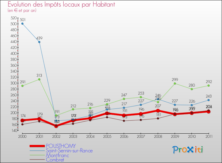 A Pousthomy, les impôts locaux par habitant ont donc augmentés de 17.24 % entre 2000 et 2011.