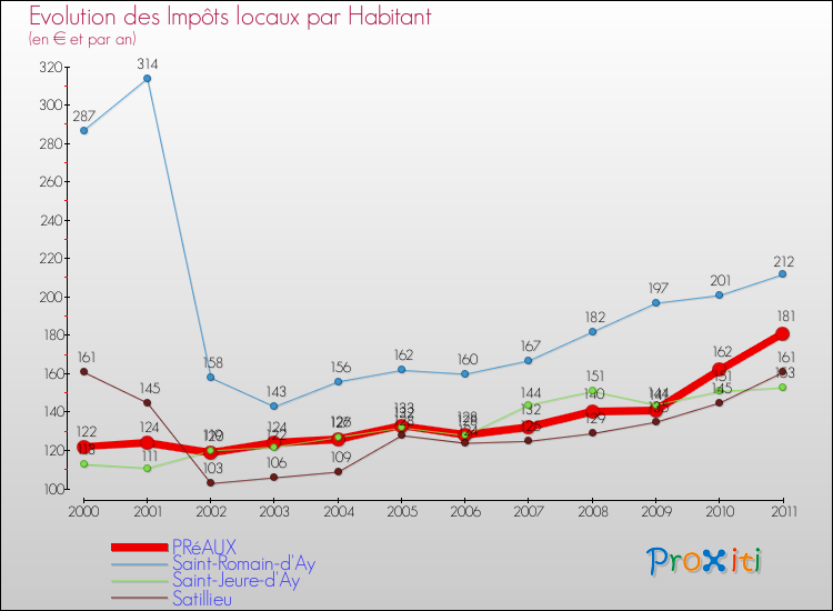 Le graphique ci dessous représente l'évolution des impôts locaux par habitant à Préaux depuis 2000.