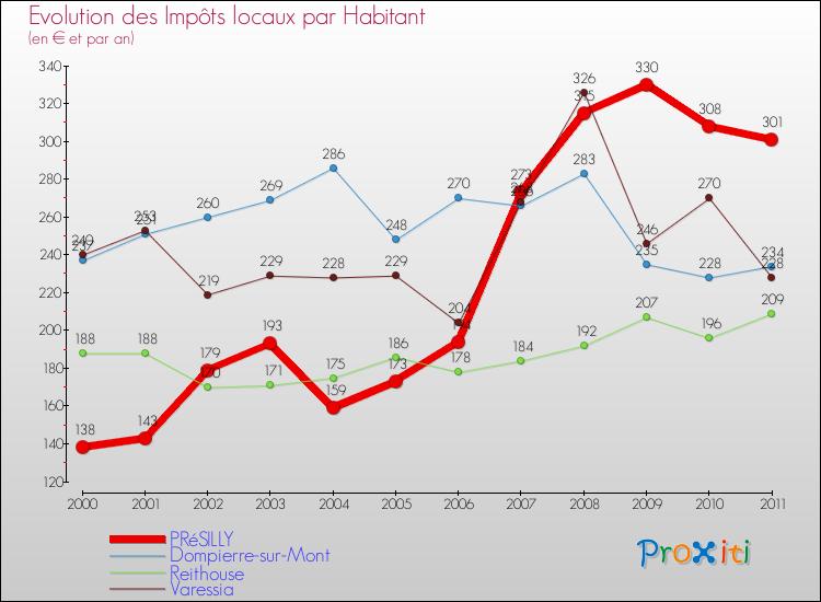 A Présilly, les impôts locaux par habitant ont donc augmentés de 118.12 % entre 2000 et 2011.