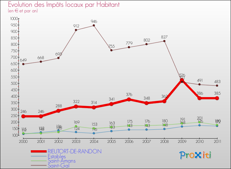 A Rieutort-de-Randon, les impôts locaux par habitant ont donc augmentés de 56.5 % entre 2000 et 2011.